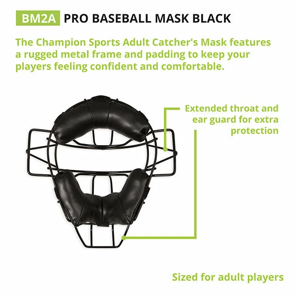 The Champion Sports Adult Umpire’s Mask features a rugged metal frame and padding to keep your players feeling confident and comfortable each time they head behind the plate. The built-in throat and ear guards provide extra protection for vulnerable areas, helping to prevent serious injuries. A harness is included to give the adult catcher’s mask a more secure fit, and the mask comes in classic black to coordinate with any team uniform.